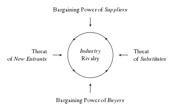 Selon ce modèle, il existe 5 (+1) forces susceptibles de capter une partie de la rente globale d'une industrie et de limiter ce degré de liberté :. Porter referred to these forces as the micro environment, to contrast it with the more general term macro environment. Il s'agit notamment des fournisseurs de l'entreprise et des produits de substitution. Selon ce modèle, il existe 5 (+1) forces susceptibles de capter une partie de la rente globale d'une industrie et de limiter ce degré de liberté : Plus ces forces sont importantes et intenses, moins l'entreprise sera capable de s'assurer des revenus importants.